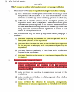 The Secretary of State may also make regulations concerning the verification of age where any person claims to have given such consent, including verification that the data subject has reached the age specified in Article 8(1), or—where a service has been assigned a different applicable age—that the data subject has reached the age specified for that service. We are ignoring that consent based services cannot be mandated neither for children nor for adults as all Muggles must simply accept the obligation to identify themselves on demand on the world wide web. We are the Ministry of Magic after all.